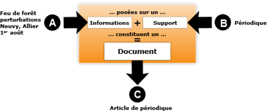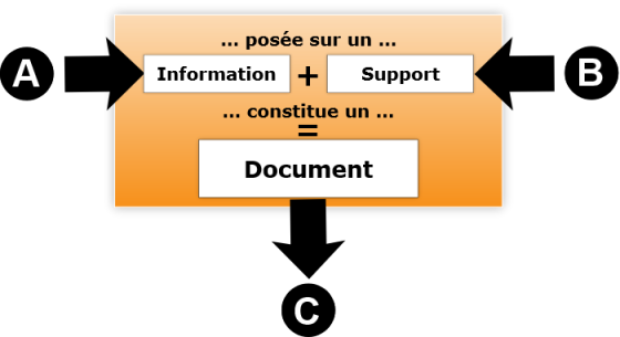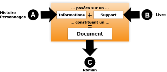 Un roman (document = C) contient une histoire que vivent des personnages (informations = A) publiée dans un livre (support = B).