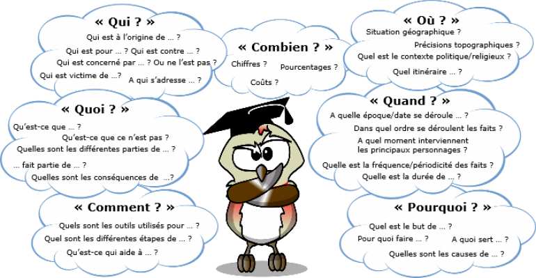 Derrière ces lettres se cachent les questions qui doivent guider nos recherches :